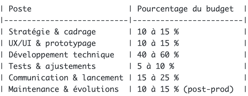 Voici un exemple de répartition d’un budget de projet d’application mobile, porté par une entreprise en création et dont la cible-produit est le Particulier :